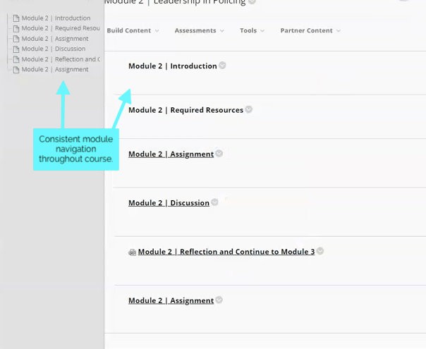 Consistent module nomenclature and navigation was important. From the Blackboard dashboard, learners could easily see what would be expected of them each week.