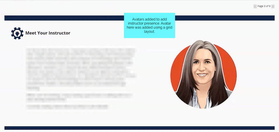 My team created this grid element using HTML to prevent excessive scrolling. The graphic design team provided this amazing instructor avatar which was used throughout the course when the learner would benefit from an instructor voice or presence.