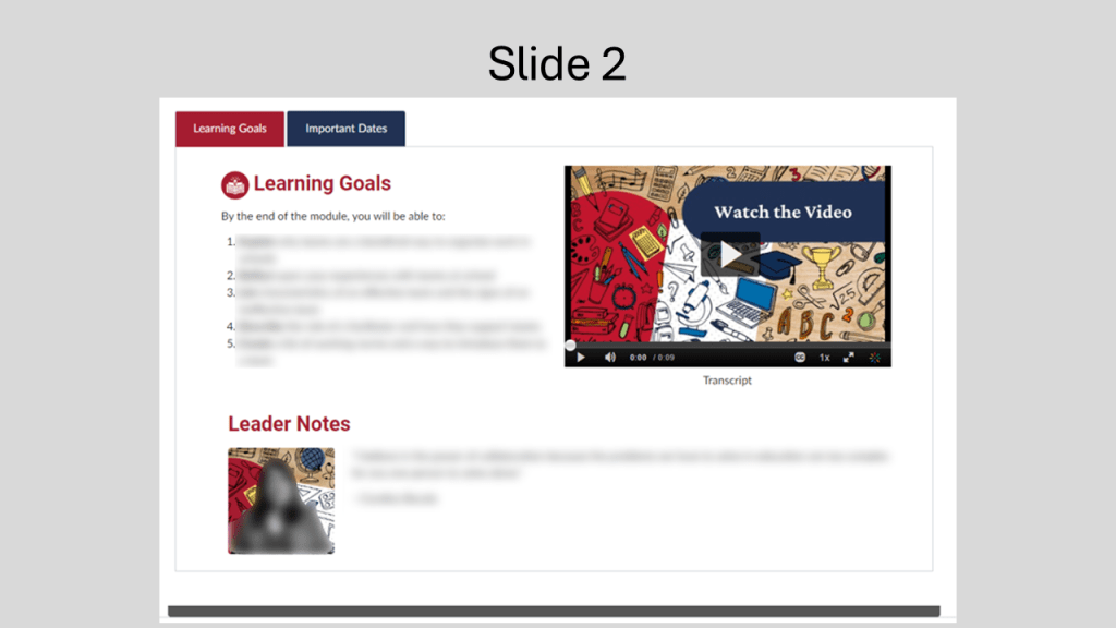 - Slide 2: Objectives, notes, dates, and instructions presented in tabs to decrease page scrolling.