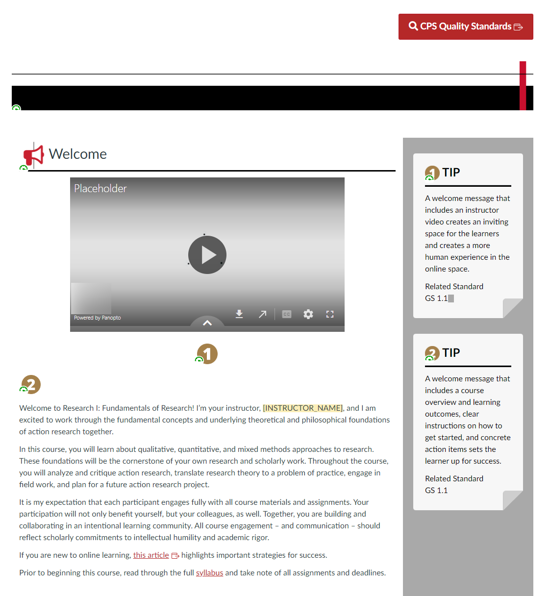 The partner requested an LMS template that provided instructors with the research based evidence behind each of the sections. We used the SUNY Online Course Quality Review Rubric (OSCQR) as a guide and a resource. Each section and page of the template included instructor facing descriptions of the importance of including that element. Not familiar with SUNY’s OSCQR? Check out the rubric here!