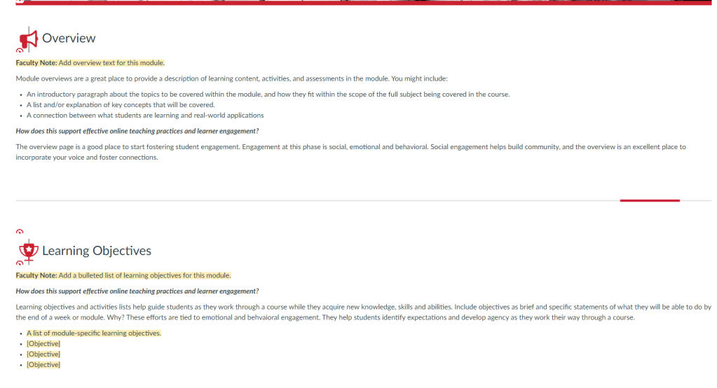 The partner requested an LMS template that provided instructors with the research based evidence behind each of the sections. We used the SUNY Online Course Quality Review Rubric (OSCQR) as a guide and a resource. Each section and page of the template included instructor facing descriptions of the importance of including that element.
