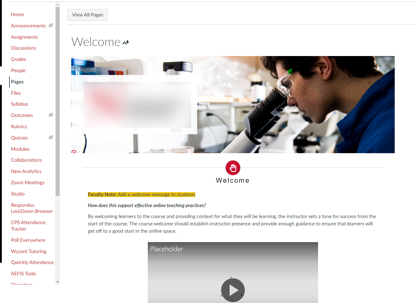 Welcome page in the course template provides instructors with information and guidance as they create this section of their course.